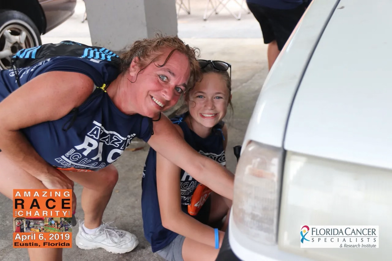 Michelle Purl and her daughter changing a tire at the 2019 Amazing Race for Charity in Florida.